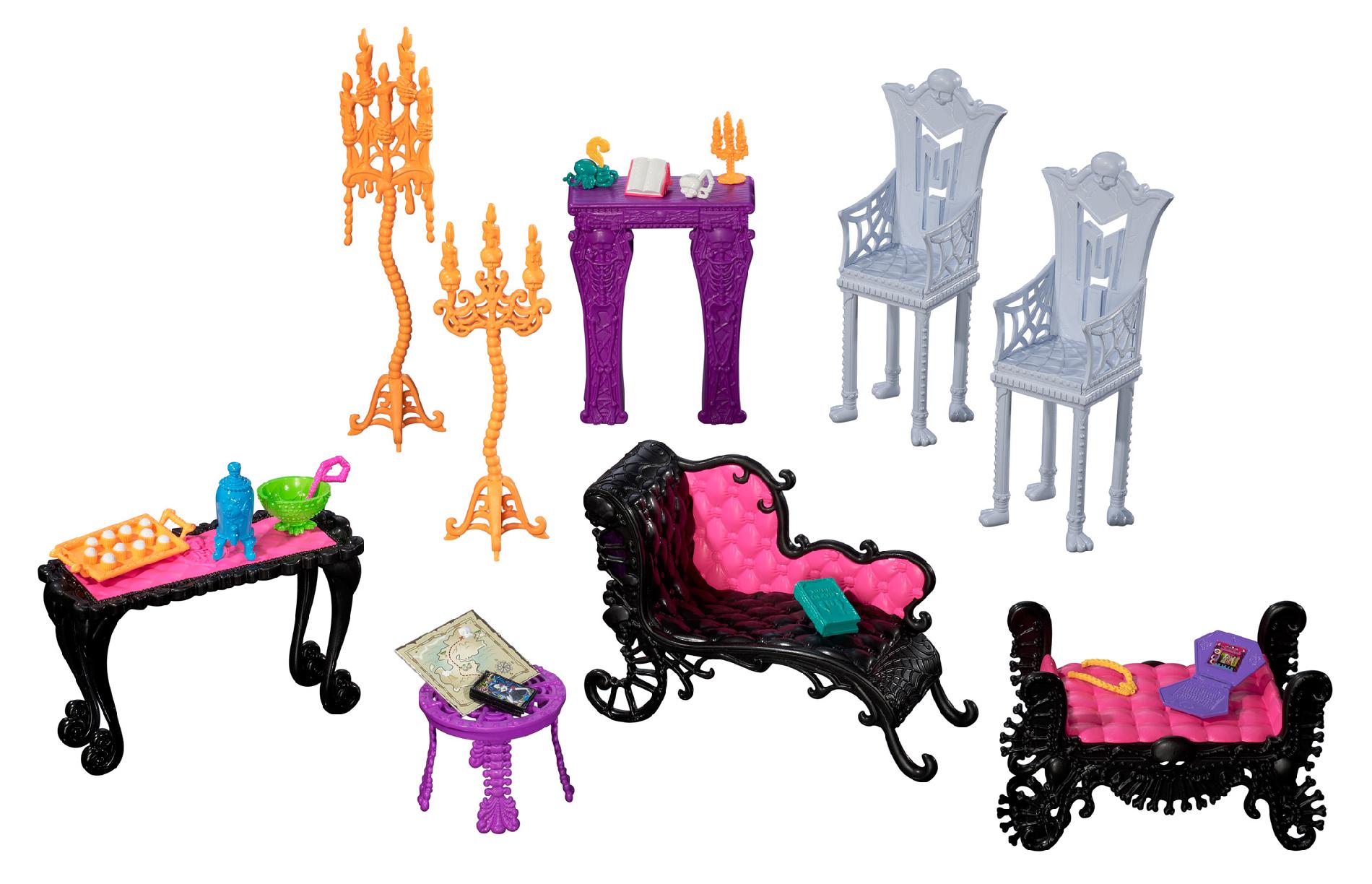 Catacombs set, two lab tables, lab chair, two dining chairs, two settee chairs, lab container, laptop, textbook, notebook, feather pen, two candelabras, one candle, two skeleton torches, one bowl, one mug, one magazine, tray of cupcakes, extra doll clips